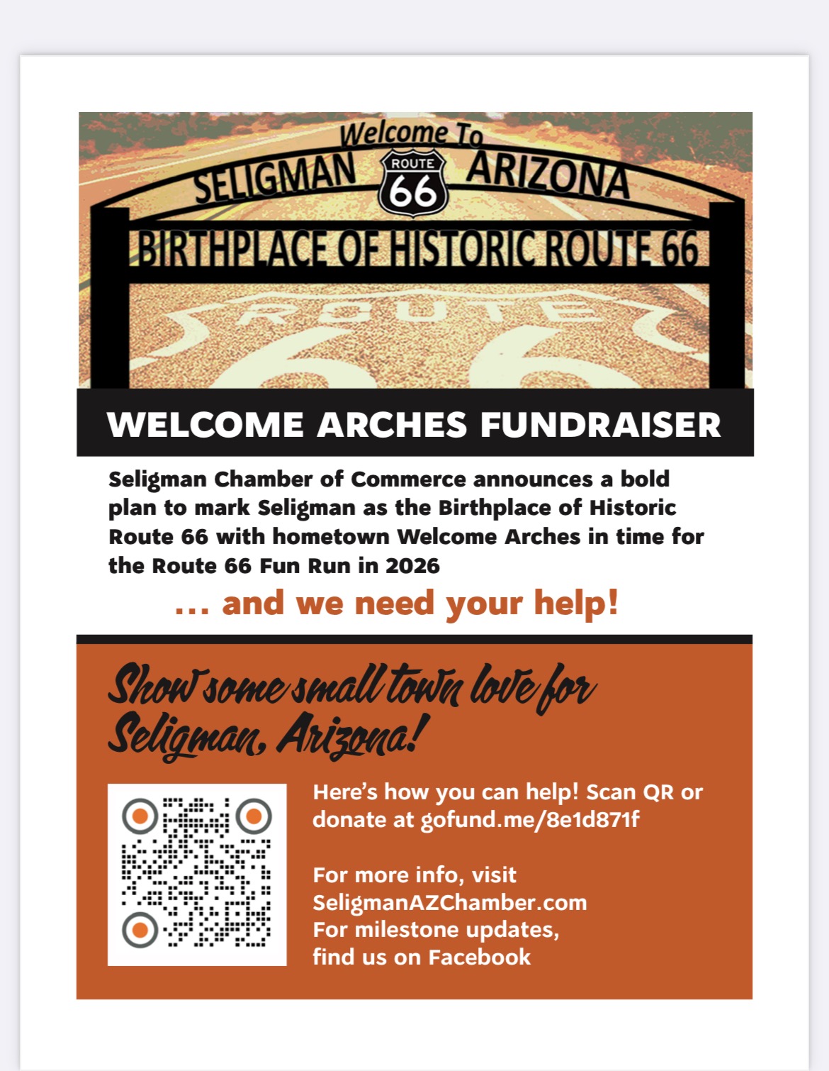 Seligman Chamber of Commerce announces a bold plan to mark Seligman as the Birthplace of Historic Route 66 with hometown Welcome Arches in time for the Route 66 Fun Run in 2026.